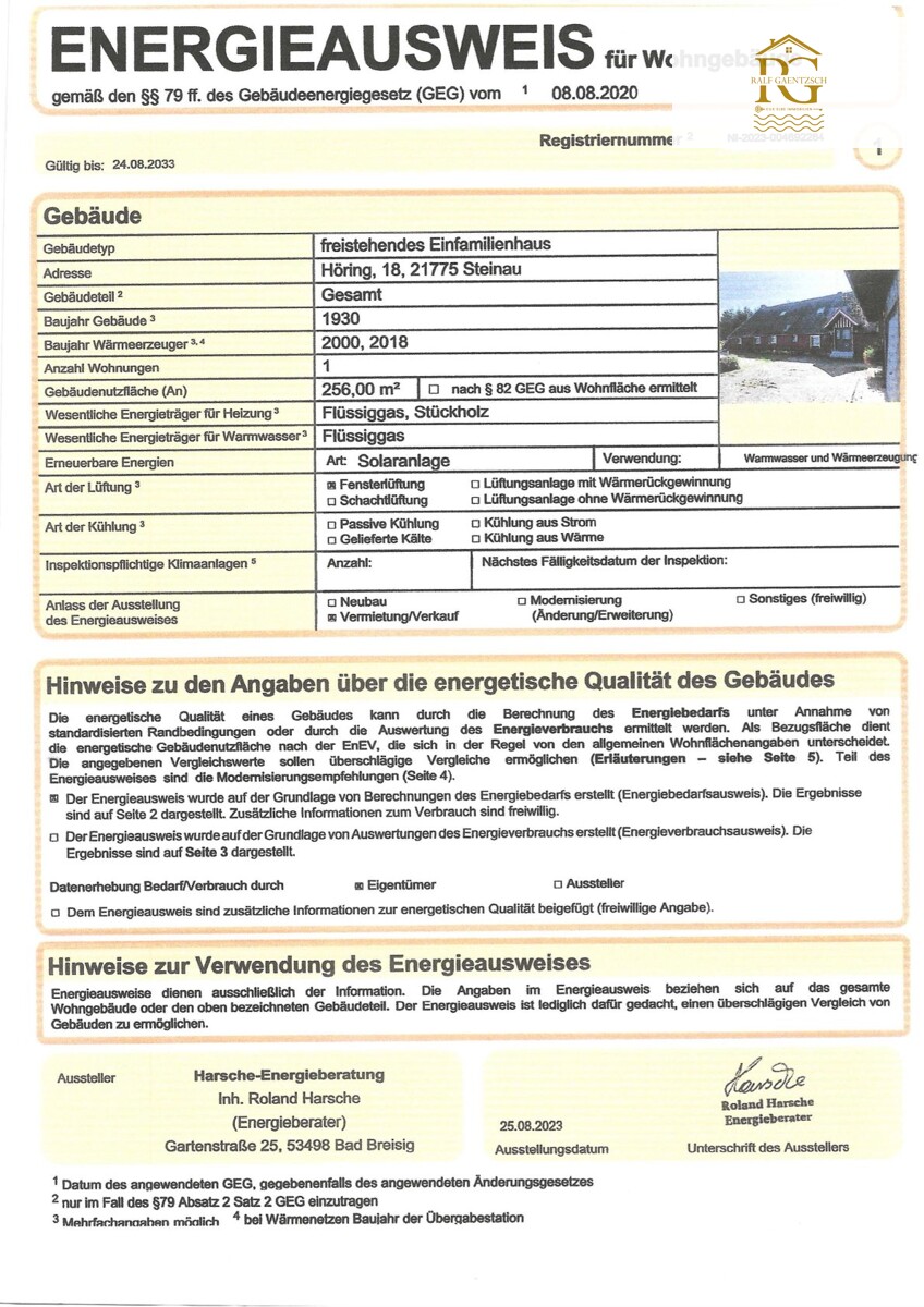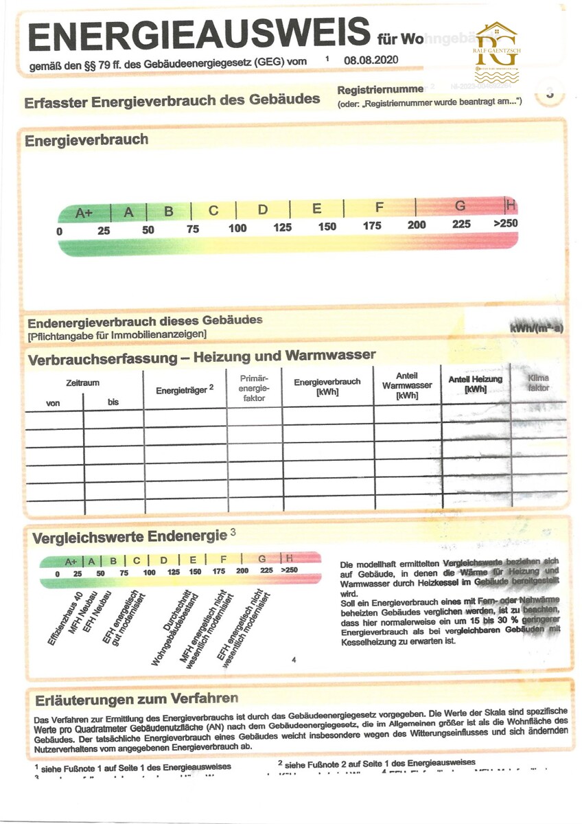 Der Energieausweis liegt in Form eines Bedarfsausweises vor und weist Flüssiggas als wesentlichen Energieträger aus.